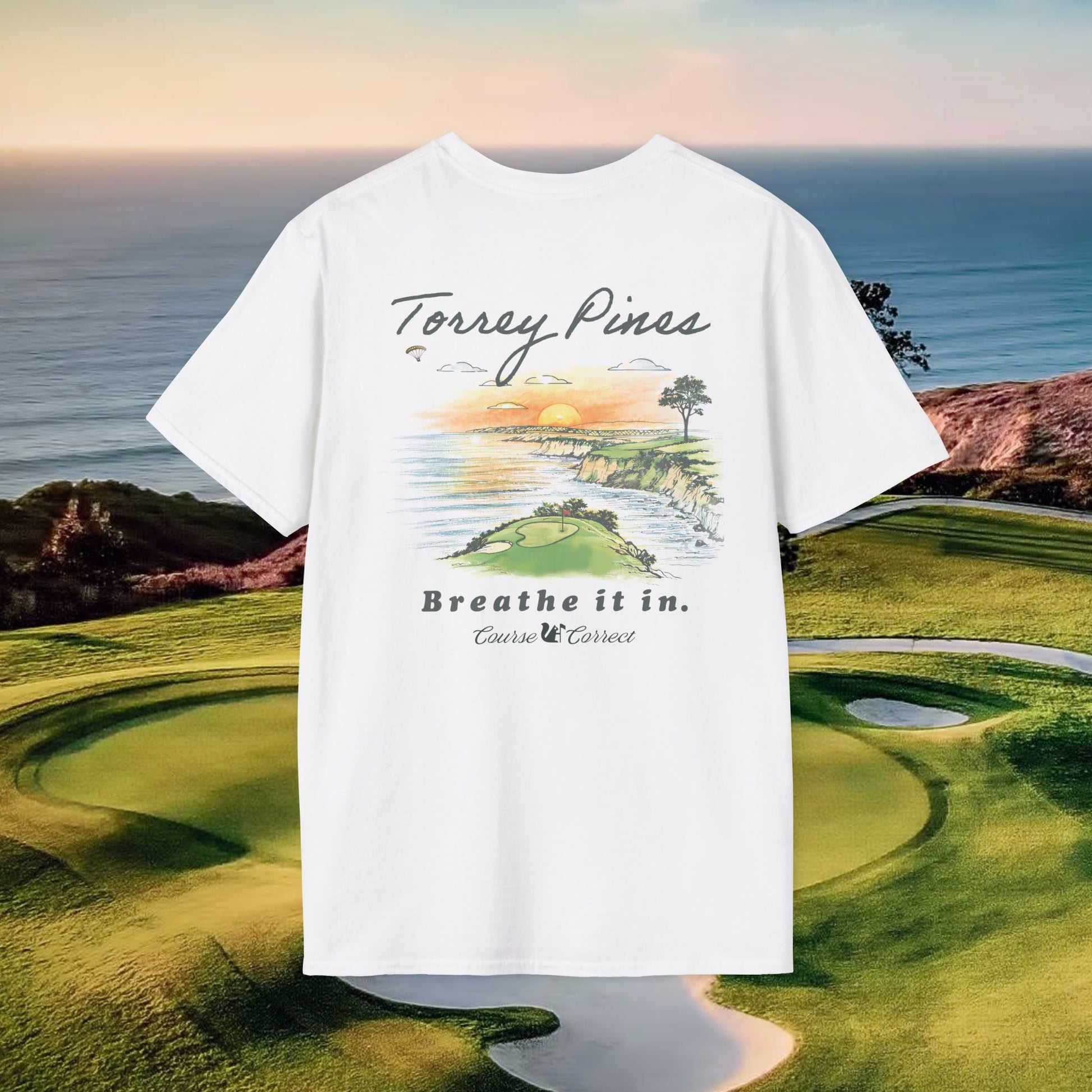 Inspired by a late-day round at Torrey Pines — fast greens, thick rough, and hang gliders drifting overhead.Soft, broken-in feel. Vintage postcard graphic. Easy confidence everywhere else.